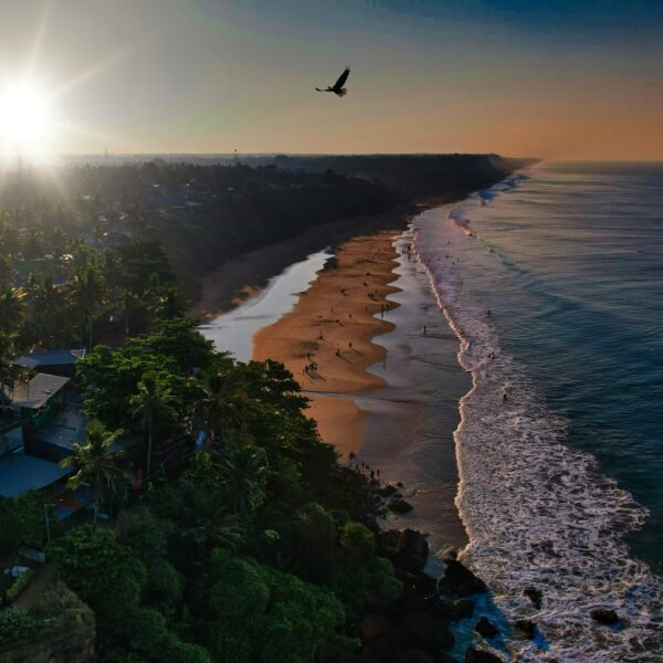 - Varkala Beach (Papanasam Beach): Famous for its red cliffs and golden sands, this beach is believed to have holy waters that wash away sins. It’s ideal for swimming, sunbathing, and watching sunsets.